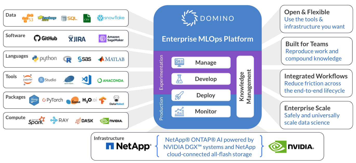 - Get started faster with streamlined configuration and deployment of your data science stack with Domino's Enterprise MLOps Platform on ONTAP AI infrastructure.