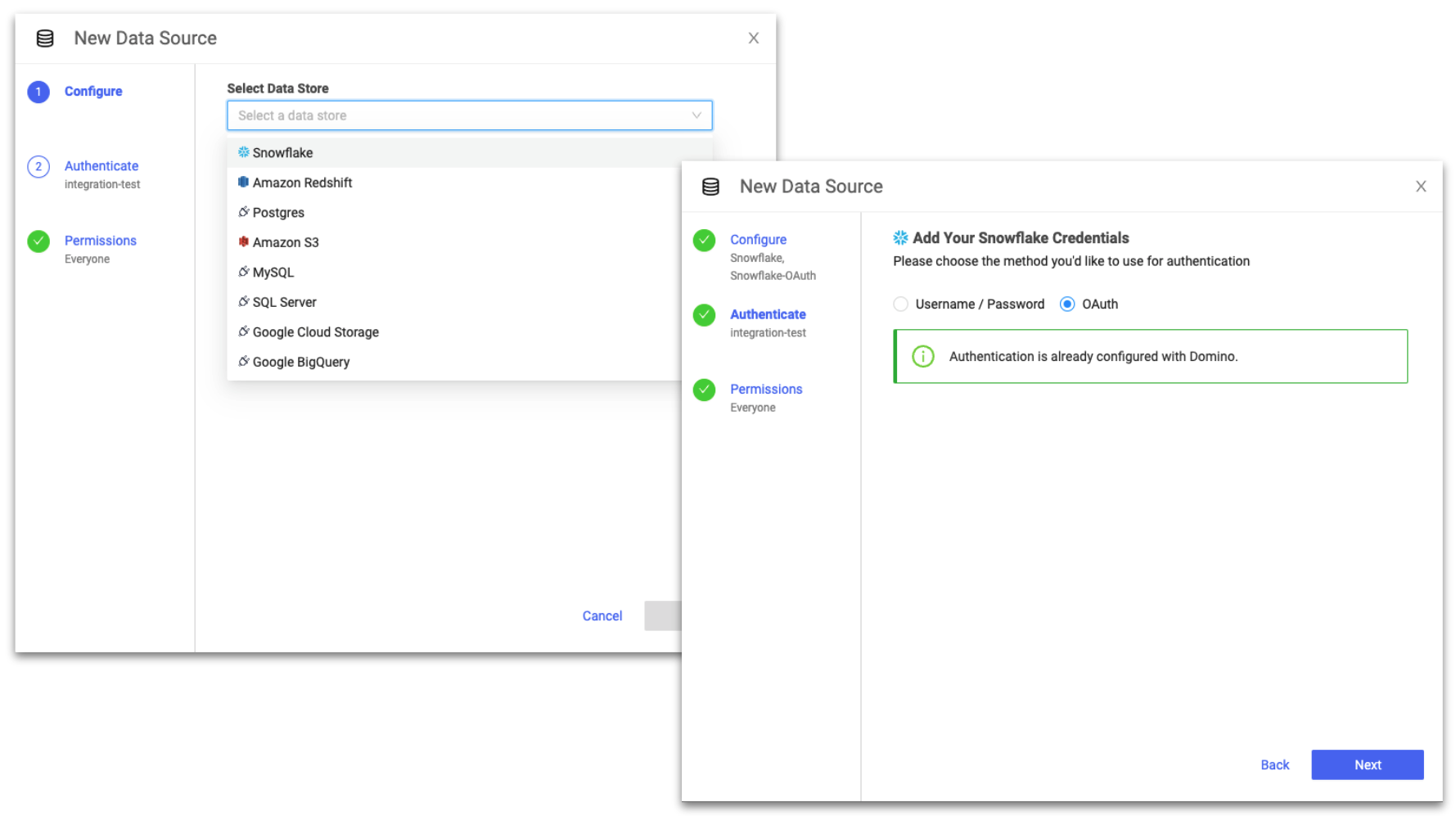 Domino natively integrates with Snowflake - with credentials or OAuth. With just a few clicks, data science teams have immediate access to data residing in Snowflake - without having to orchestrate the movement of data through manual workarounds.
